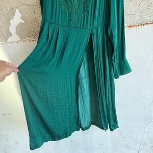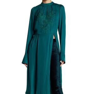 Free People’s New Day Tunic Top an emerald green embroidered piece with a flowy, longline silhouette and that signature split front for effortless layering. Lightweight crinkled crepe drapes beautifully, finished with tonal embroidery and buttoned cuffs for an elevated boho feel.