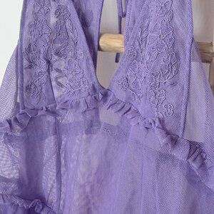 Elevate your wardrobe with this stunning Free People tunic top! It showcases a delightful floral embroidery, ruffled mesh, halter neckline, and pleated details, making it a true statement piece.