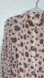 Semi-sheer fabric in peachy cream color with all over purple medallion print features a separate slip liner in beige. Slip has adjustable spaghetti straps. Dress has a ruffled neckline and buttons all the way down the front of the dress. Pintuck accents at shoulders add pleats for fullness and elastic gathered panel runs from each side and along back of dress. Back yoke is also gathered. Bishop sleeves are fitted to elbow and then balloon out to the elasticized cuffs. Very lightweight and flowy.