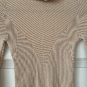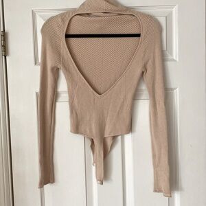 Size small, soft, ribbed with an open back. Cream/tan color. Worn once like new condition!