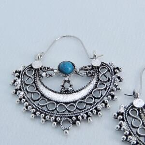 Free People Turquoise Pewter Earrings with Turquoise Bead. Moroccan Detail Silver Earrings, Engraved Geometric Detail