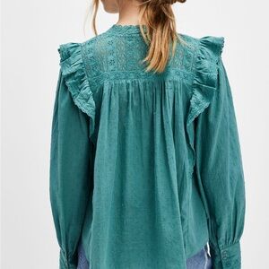 Boho turquoise blouse with ruffled shoulders. Button-up design. Ideal for casual outings. This item is oversized and can fit a M or L well.