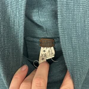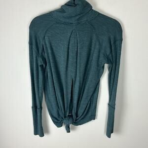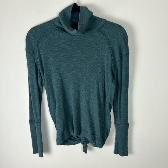 Gently Used Free People Turtleneck Light Sweater. This is a women's XS. Pretty shade of emerald green throughout. Exposed seams. Ties together in the back. 50% polyester, 38% cotton, 12% rayon.