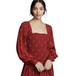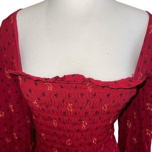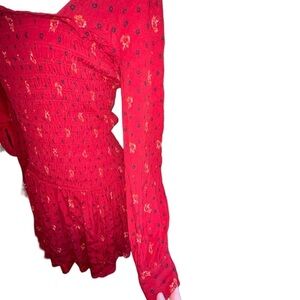 Free People Two Faces Dress Size M Red Floral Elastic Bodice Long Sleeve