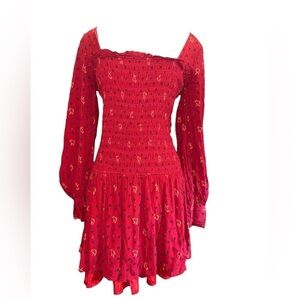 Free People Dress Size M Red Floral Elastic Chest/Waist Long Sleeve