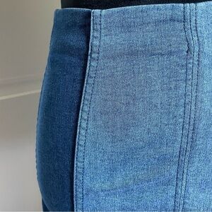 Two tone denim skirt from Free People. This skirt features multiple panels of stretch denim for free movement, mini skirt cut, zip back enclosure.