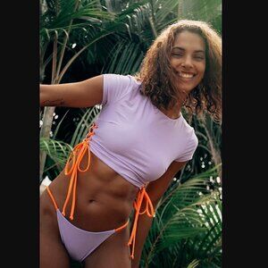 So cool in a cropped tee silhouette, this cap-sleeved bikini top features exaggerated, contrast lace detailing at sides for added dimension.