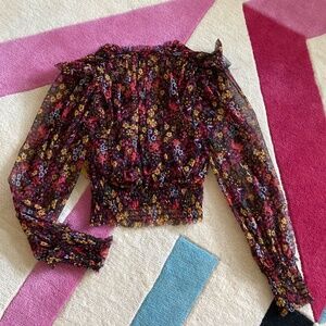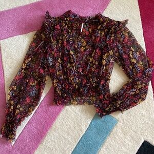 Free People Twyla Black Red Yellow Floral Mesh Long Sleeve Crop Top Blouse XS