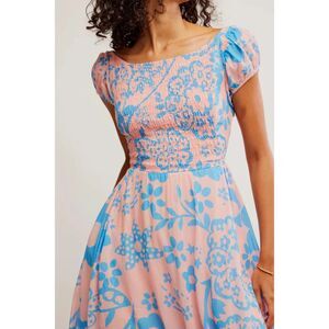 Product Description.Featuring smocked top piecing with puffed sleeves.Pleating at bottom.Wide scoop neckline.Side pockets.Contrast bottom trim.Strappy back detailing for added dimension.Partially lined.Back tie closure.Free people dress.SizeLarge, L, US 10Bust19 inches (Stretched 21 inches) across Waist15.5 inches (Stretched 17.5 inches) acrossLength54 inches approx. (without strap)ColorPale Pink ComboFabric100% Cotton.Lining100% Cotton