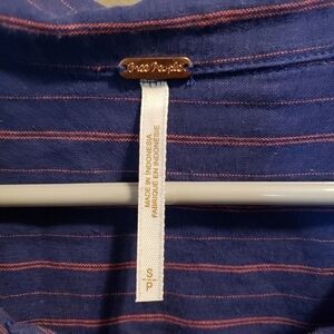 Free People Under the Boardwalk Striped Linen Blend Blouse. Women's size small. Preowned in excellent condition. Like new. The Under the Boardwalk Blouse gives off nothing but chill vibes with its oversized construction for a loose, relaxed fit. Fit: this style fits true to size. - Spread collar - Long sleeves with single barrel square cuffs - Lace-up bust - Striped print - Gathered back construction - Approx. 28.5" length (size S) - ImportedFiber Content55% linen, 45% cotton