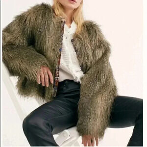 Free People Unwritten Faux Fur Shag Jacket Tribal Embroidered Trim