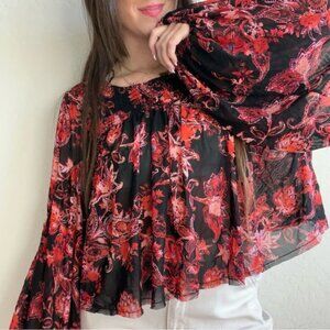 Free People Up for Anything Onyx Floral Boho Semi-Sheer Lined Smock Top Size M