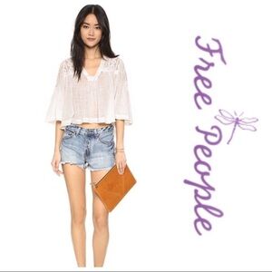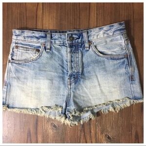 Bold Free People high-rise denim shorts with heavy fading and frayed leg openings. 5-pocket styling. Button fly.
