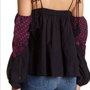 Embroidery accents details the yoke and sleeves of this cold shoulder top.