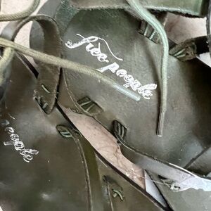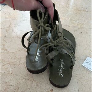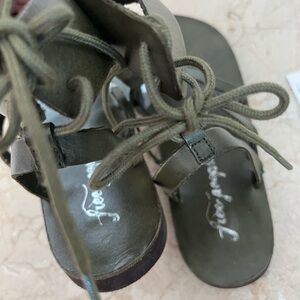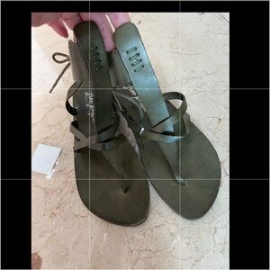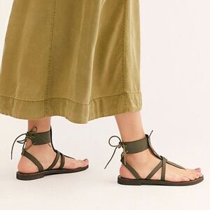 Slim straps crisscross atop the T-strap of a carefree sandal that ties at the back of the ankle for a utilitarian finishing touch