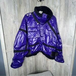 Free People Royal Purple Bomber Jacket with a Slouchy Silhouette. Removable Cargo Pocket at Front. Zipper and Snap Front with a High Neck and Fleece Lined Collar. Bomber Style Jacket hits at the Waist. 100% Nylon with Nylon Lining. Polyester Filling.
