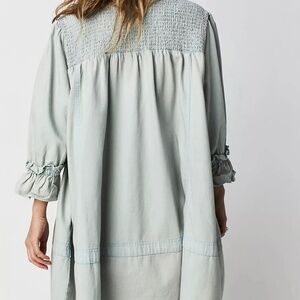 Dress has pockets and is super cute on. The color is like a bleached denim and has one small spot of discoloration- I think from the color treatment they did. See photo attached. Excellent condition, hardly worn.