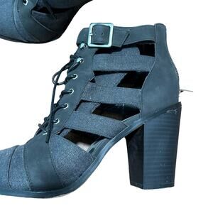 These heels have a classic, chunk look with no flaws or marks! They are a lace up style with a pointed toe that's great for a night out on the town.