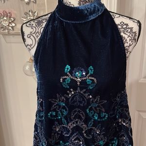 Gorgeous Velvet swing dress with Sequins by Free People NWT. Size Small in a deep blue shade with sequined embellishment on front and back. Thus has never been worn! I bought for a Party and decided on a different style. Depending on height you can wear this as a dress or Tunic. Absolutely Stunning!! From Smoke And Pet Free Home