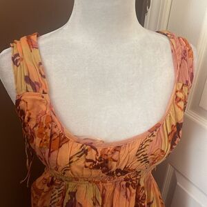 Free People Vernon Mini Dress NWT Size Medium 100% cotton with100% viscose lining sleeveless with self tie accent on shoulder accents mini length elastic waist orange with all over floral print two tiered skirt design scoop neckline side seam pockets