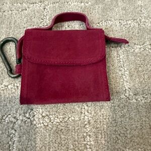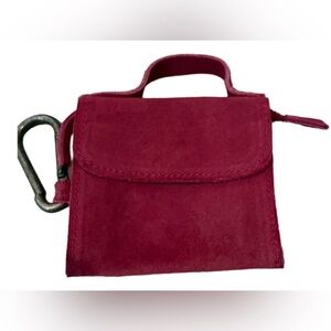 Chic suede key holder with a bold red hue. Features a sturdy clip for easy attachment. Stylish and functional accessory.