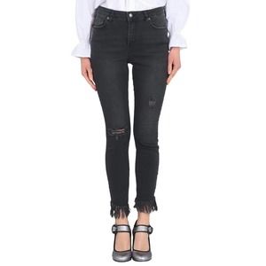 Free People Great Heights Frayed skinny denim pants in black. Make a statement in these frayed skinny leg jeans, featuring allover distressing and asymmetrical frayed hem at the ankles. These jeans have a super stretch denim, mid-rise with five-pocket styling and a zip fly.