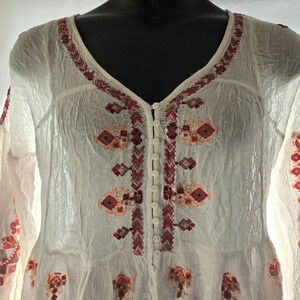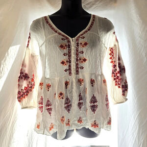 Pretty white top with a babydoll style, with orange and magenta embroidery. Vintage, Crepe white fabric, super cute boho design. Order it today ❤️.