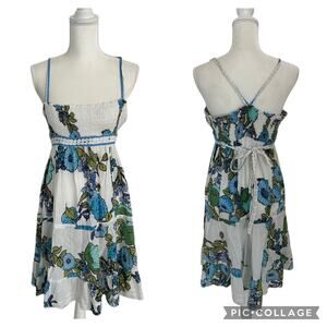 Free People Vintage Smocked Blue Floral Knee Length Dress Small Medium Cottage