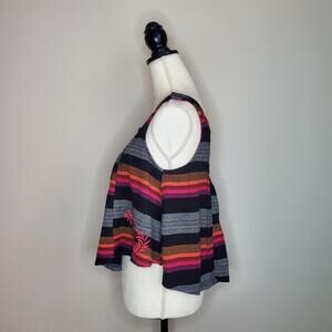 Breezy and effortlessly cool, this top brings boho charm to everyday wear. Designed in lightweight cotton, it features a carefree flowy look. The multicolor stripes a playful pop of color, while the subtle embroidery gives it an artisanal touch. Pair it with cutoffs or layered jewelry for that relaxed, festival-ready vibe.
