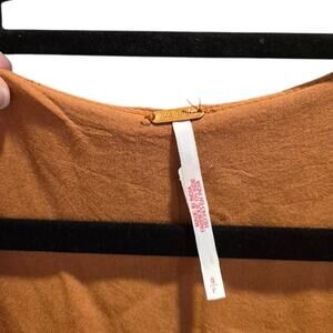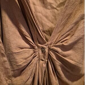 This vintage midi dress is from Free People free-est collection. It features a V-neckline, button-front design, a knotted bust detail, subtle puff sleeves, and ruching throughout. This is a relaxed, longline silhouette.