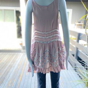 Sheer dotted slip dress with lace inset throughout. Ruffled hem.