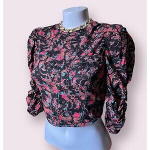 The Free People WOMENS Monica Floral Corset Top is a stylish and trendy piece perfect for various occasions such as travel, parties, or casual wear. This black, Aqua,cherry red & orange print top features a beautiful floral pattern, 3/4 puff & runched sleeves, a round neckline, and a cropped backless design. Made lightweight woven cotton, this blouse is also adorned with corset seams giving it a unique look.