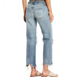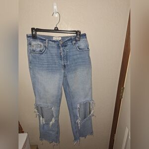 Free People WTF Maggie Mid-Rise Jean EUC Size 27 in light wash distressed knees raw hem button fly waist measures 15" rise 10" inseam approximately 26"