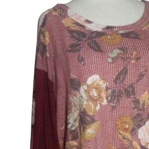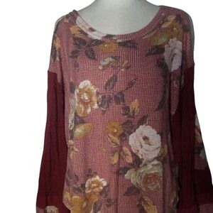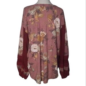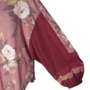 Free People Waffle Knit Peasant Sleeve Floral Print Blouse Size Large Burgundy