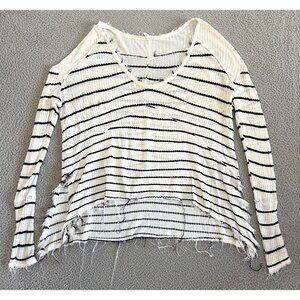 Free People Waffle Knit Thermal Top Womens Sz XS Cream Ivory Blue Raw Hems