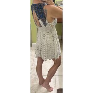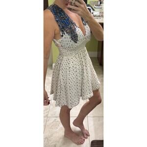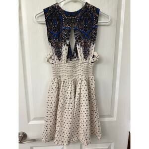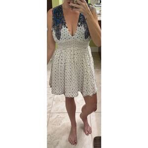 Free People Walking Through Dreams Floral Tunic Fit & Flare Dress Boho Small, cream blue hippie mini dress, open back v-neck, date night, festival, event, resort, cottge, fairy, whimsical, romantic, western, country, girly,
