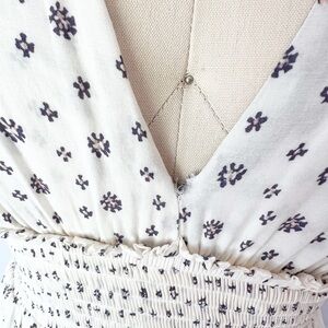 Chic mini dress with a white base and striking blue shoulder print. Super soft material, fully lined. One flaw, a bit of damage at the bottom of the V of the neckline as pictured. Marked size M.