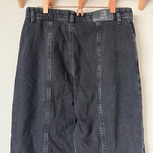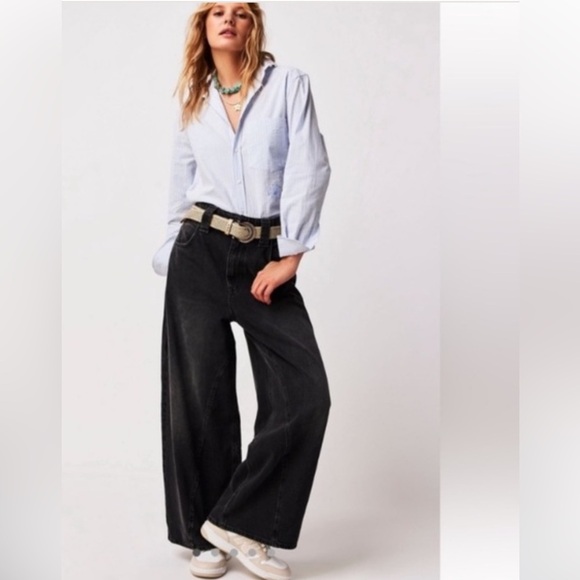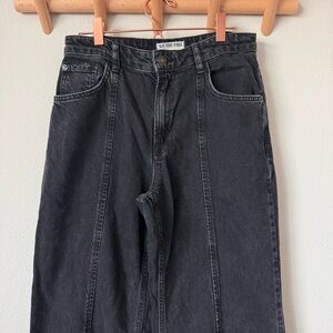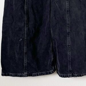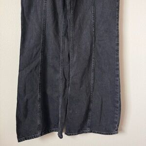 Black wide leg flare jeans with seam done the middle. In good condition with a small spot on the back as shown.