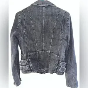 Washed black denim moto jacket by Free People. Asymmetric zip front with multiple zip pockets. Panel stitching and zip cuffs. This jacket is the Free People Denim Buckle Detailed Zip Moto Jacket. It is a black/gray denim motorcycle-style jacket featuring distinctive hardware and a structured, "grunge" aesthetic.