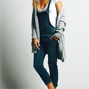 Free People washed denim overalls. 5- pocket style. Two button hole adjustable crisscross straps. Pocket detailing on front bib. Has stretch. Zipper on one side.