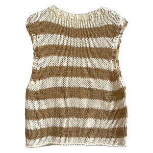 Soft, airy open-knit pullover tank with neutral ivory and tan striping. Relaxed, boxy silhouette with ribbed trim for an effortless, coastal look. Perfect for layering over bralettes or pairing with denim shorts and sandals for a breezy day out.
