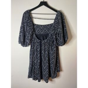 Grey and black “Wavy Baby Got Back “babydoll mini dress/tunic from Free People. Square neckline. Empire waist. Puff sleeve. Open back with ribbon tie detail. Soft, textured French Terry cotton. Size S. Approximate flat lay measurements- Bust: 18” across from armpit to armpit. Length: 32”. Gently preowned condition with no tears or stains.