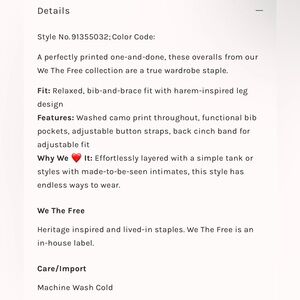 Free People Way it Goes Camo Harem Overalls Size Large NWT