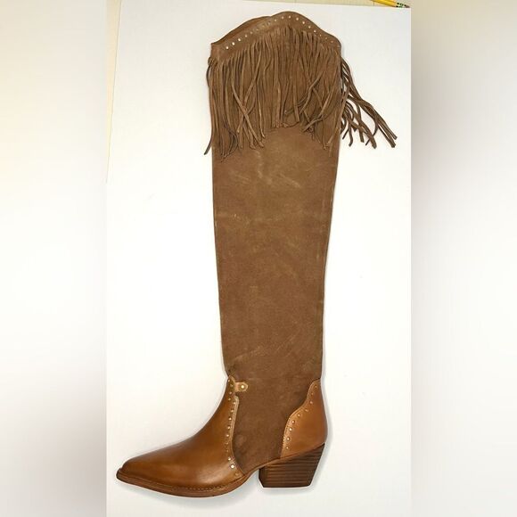 Free People Wayne Fringe Suede Over The Knee Leather Western Boots Brown 6 NIB