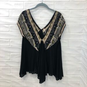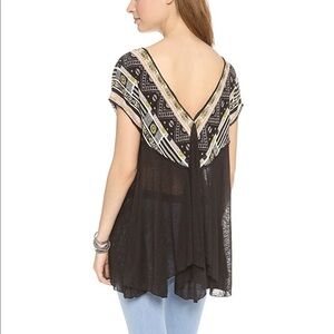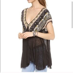 Patterned gauze panels lend soft structure to a draped jersey Free People top. Deep, double-V neckline. Short sleeves. Semi-sheer.