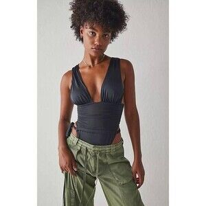 Free People We Are HAH Cut To The Chase 1 PC Bodysuit Swimsuit Size S Noir Black