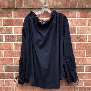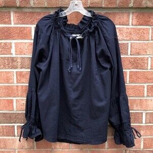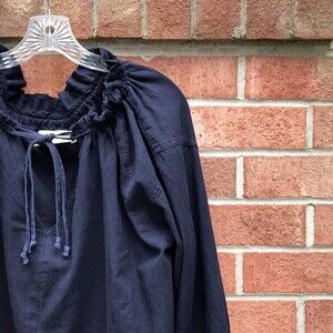 Free People We The Free Alpine Denim Ruffle Top sz M NWOT, Dark Ink Blue, Over-Sized, Adjustable Gathered Ruffle Neckline and Sleeves, Distressed Hem, BOHO, new & never worn
