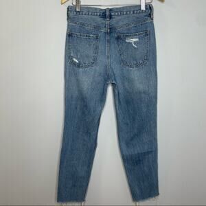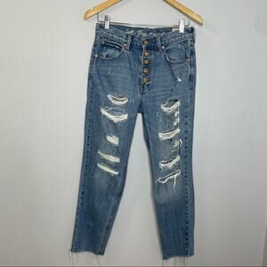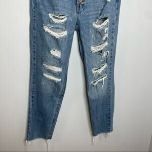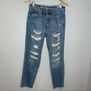 High rise button fly, rips /distressing throughout, and a raw hem edge at a cropped length.
