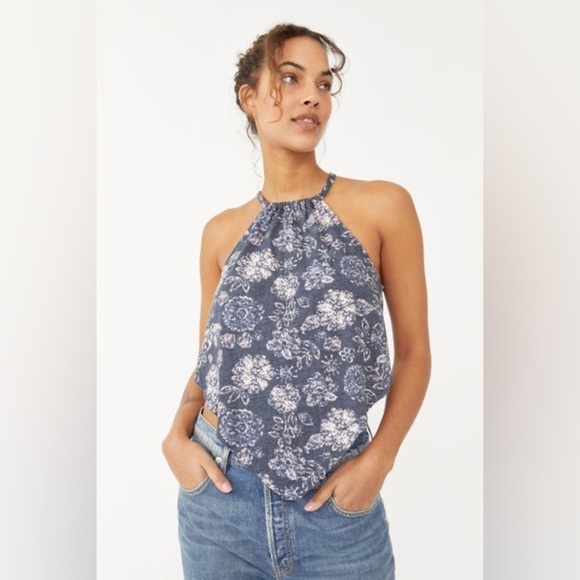 Cotton tank top from We The Free by Free People. This tank top features 100% cotton fabric, blue, white and pink floral pattern, semi-cropped hem.
