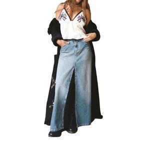 This maxi denim skirt by We The Free is a versatile yet distinctive piece in light wash denim, designed with a high waist and front slit. Its relaxed silhouette and durable cotton composition make it a stylish yet functional wardrobe staple, suitable for various looks.